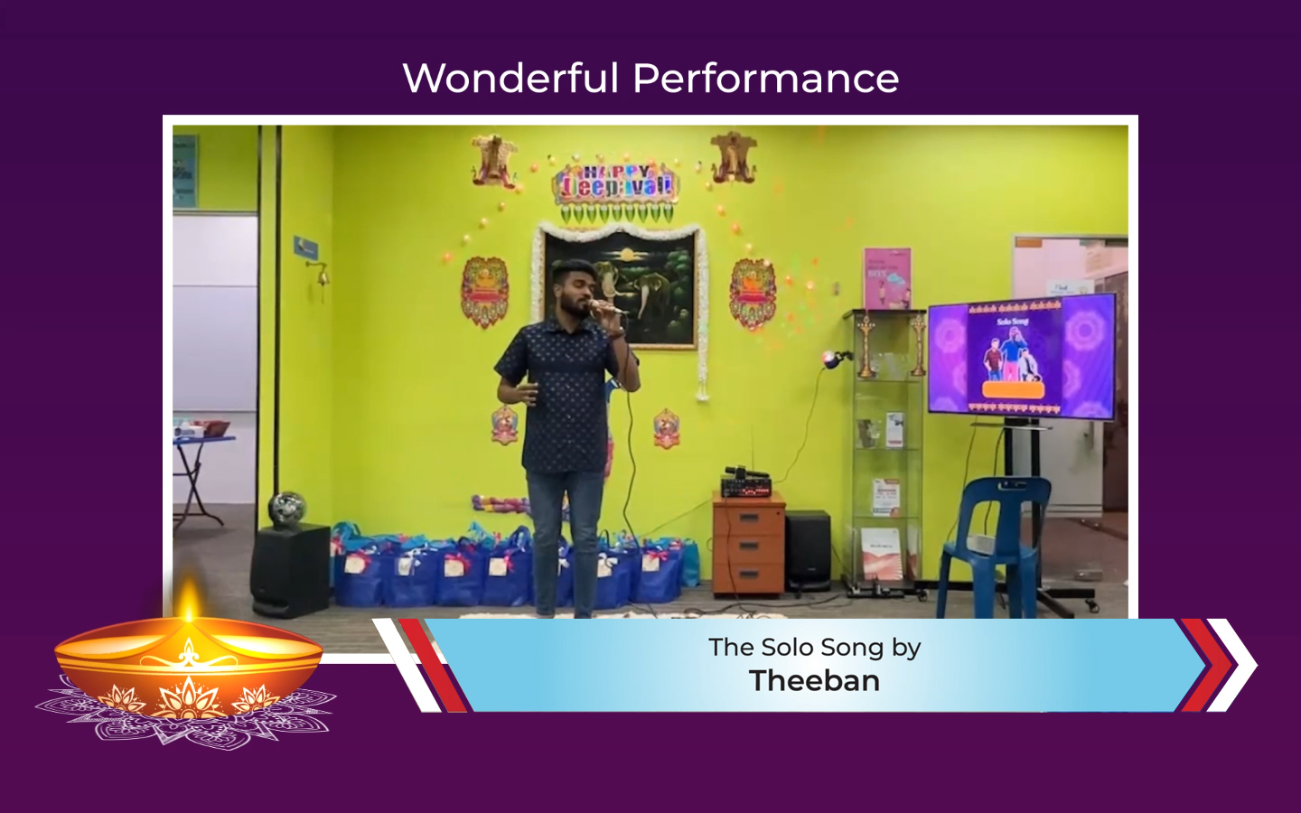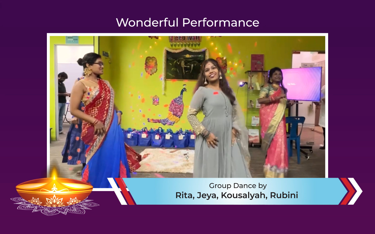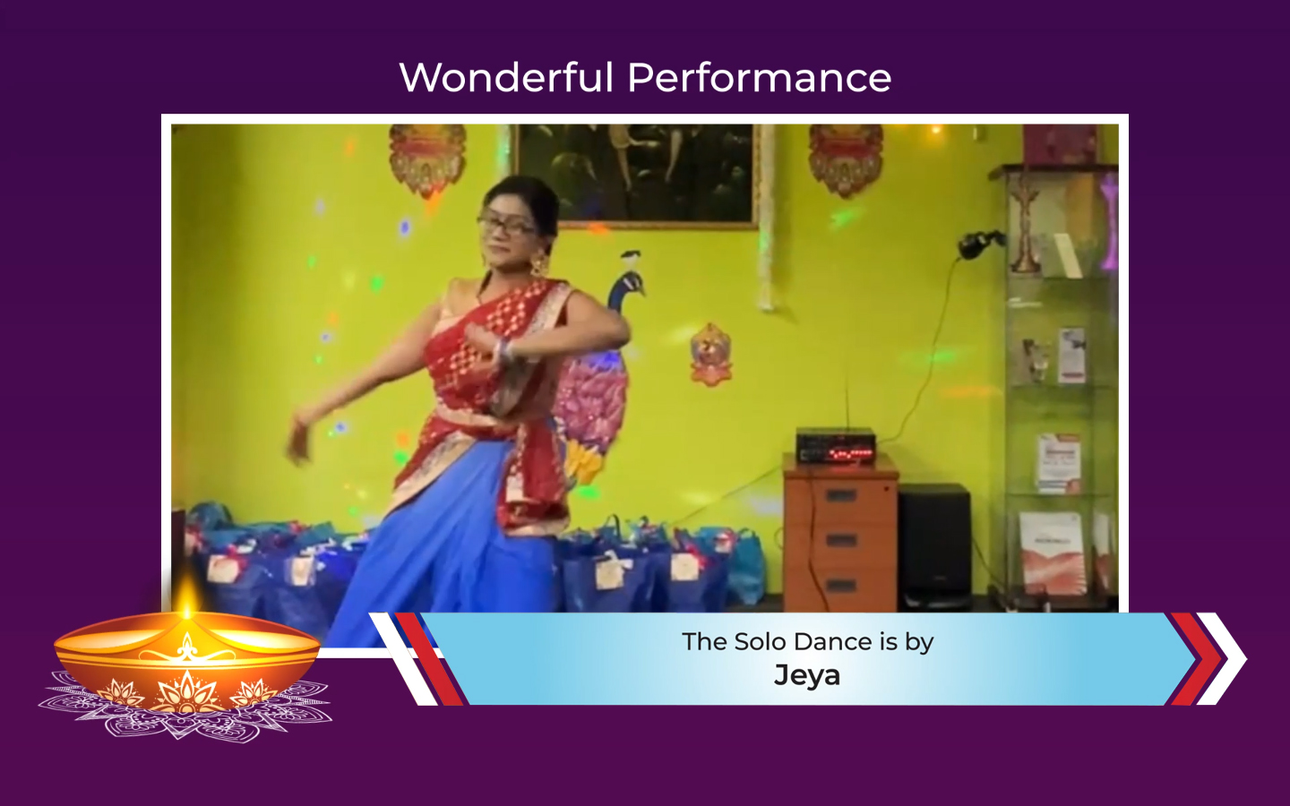 See full videoThe next performance was a marvellous solo dance by Jeya, Boss’s executive, who danced ‘Bharata Natyam’ to the song Minsara Kanna. This dance also originated from a famous movie, Padaiyappa.